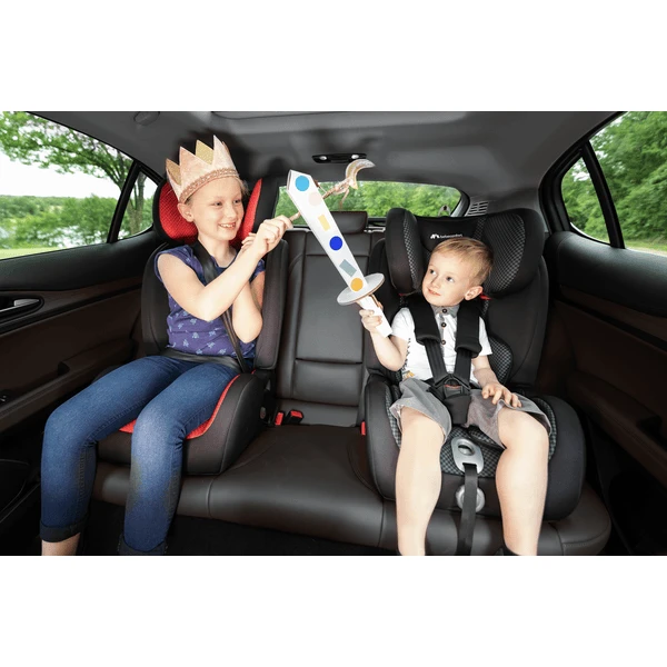 - Peuterautostoeltje met riempjes (maat 1) dat kan worden omgevormd tot een zitverhoger met rugleuning (maat 2/3).