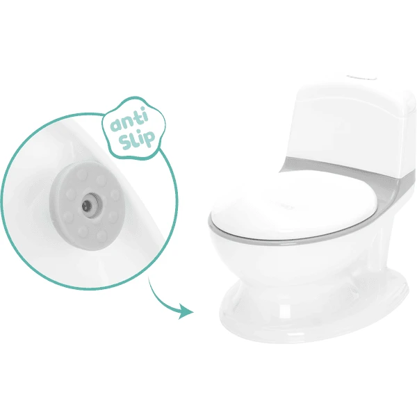 Tijdens de ontwikkeling lag de nadruk vooral op het leereffect en het spelenderwijs trainen. Het realistische uiterlijk en de bijbehorende functies maken de overgang van luier naar potje veel gemakkelijker en interessanter voor het kind, omdat het de basisvorm en het uiterlijk al kent van het toilet van de ouders. Het nieuwe minitoilet biedt uw kind de mogelijkheid om na het toiletbezoek het deksel te sluiten en op de doorspoelknop te drukken, die dan een realistisch doorspoelgeluid maakt en oplicht. Om de meest realistische toiletervaring compleet te maken, kan een nat doekje uit de achterkant van de stortbak worden gehaald.