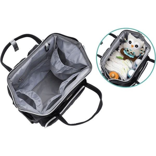 Dankzij de vele binnen- en buitencompartimenten blijkt de wrap-around rugzak een echt opbergwonder te zijn. De zakopening van de dokter maakt het gemakkelijk om de inhoud op te bergen, zodat u de inhoud in één oogopslag kunt zien en u zich het gedoe van het zoeken kunt besparen. Of u hem nu sportief over uw schouder draagt of gewoon op de kinderwagen monteert – de rugzak past zich flexibel aan uw wensen aan. Voor de bevestiging aan de kinderwagen worden twee haken meegeleverd. Een uitneembare aankleedkussen is ook inbegrepen. Dit maakt het verschonen van luiers onderweg kinderspel, want het opvouwbare verschoonmatje is altijd klaar voor gebruik.