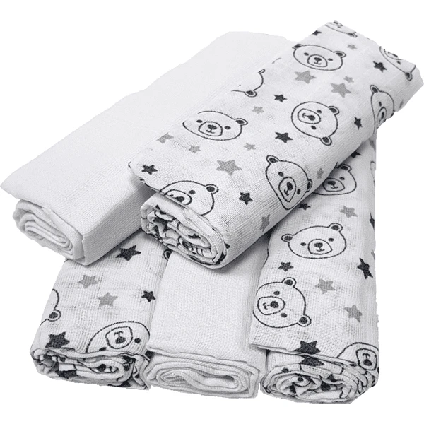 Prachtige 5-pack gaasdoeken van 100% zacht en hoogwaardig tiger katoen – ideaal voor het eerste pakje van de baby! De gaasdoeken zijn perfect te gebruiken als slabbetjes, spuwdoeken of wikkeldoeken.