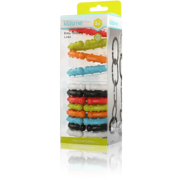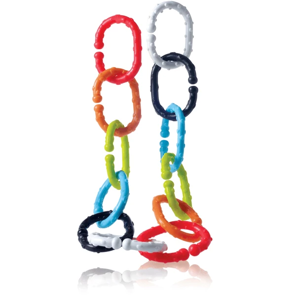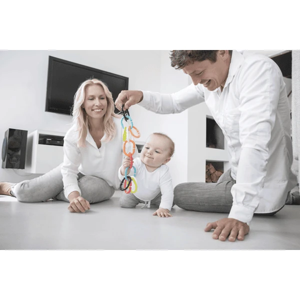- De 12 kleurrijke ringen kunnen worden samengevoegd om de ketting aan de buggy of het kinderbedje te bevestigen
