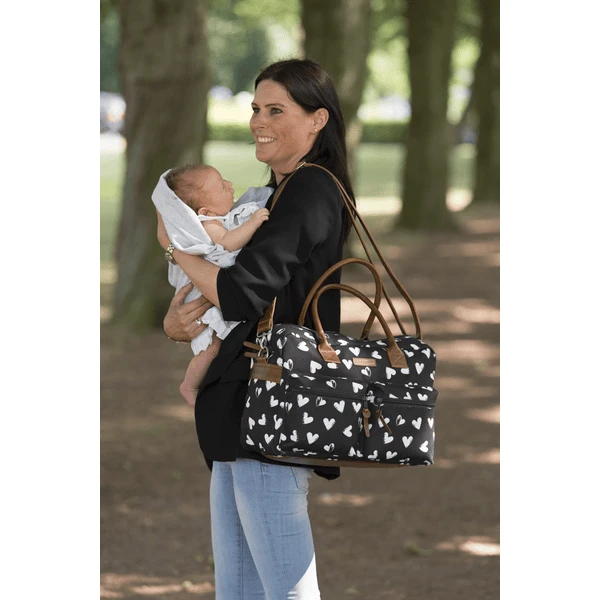 De luiertas heeft twee vakken aan de voorkant en is zeer ruim, met meerdere vakken aan de binnenkant.