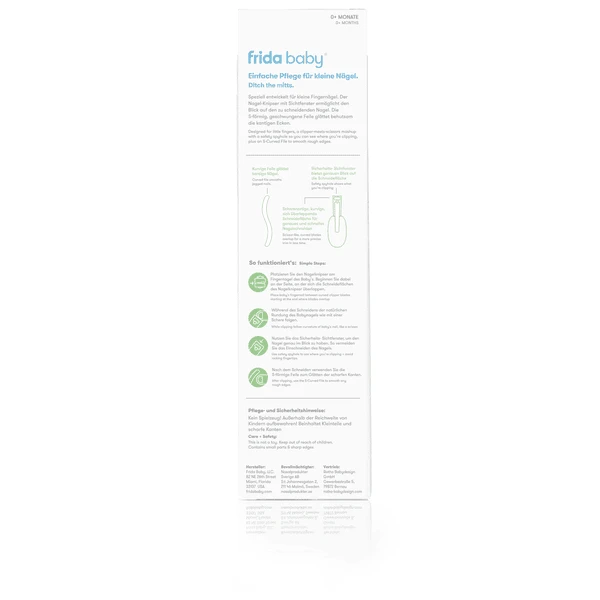 De set bevat ook de S-vormige baby nagelvijl, die speciaal is ontwikkeld voor kleine nageltjes. De gebogen vijl volgt de natuurlijke kromming van kleine babynageltjes, waardoor het gemakkelijker wordt om ruwe nagelplekjes voorzichtig en gemakkelijk glad te strijken.