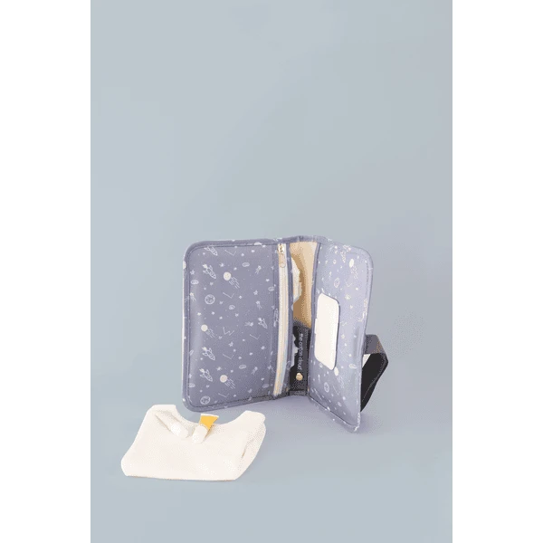 Product details: Luiertas in de iconische Design Design Kosmische Luiertas met groot verschoningsmatje en vochtige doekjescontainer Navulbare container voor vochtige doekjes bevat tot 50 vochtige doekjes Met grote zak met rits voor verzorgingsartikelen Kan gemakkelijk aan de kinderwagen worden bevestigd